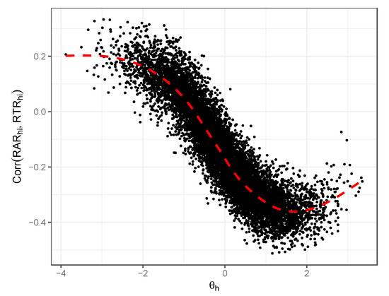 Illustration of relationship between respondents’ general latent proficiency and estimated response accuracy/response time residual correlations; simulation illustration.