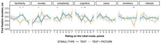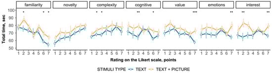 | Text area total fixation duration | TEXT | −0.08 | 0.10 * | 0.07 | −0.04 | −0.07 | −0.01 | 0.02 |