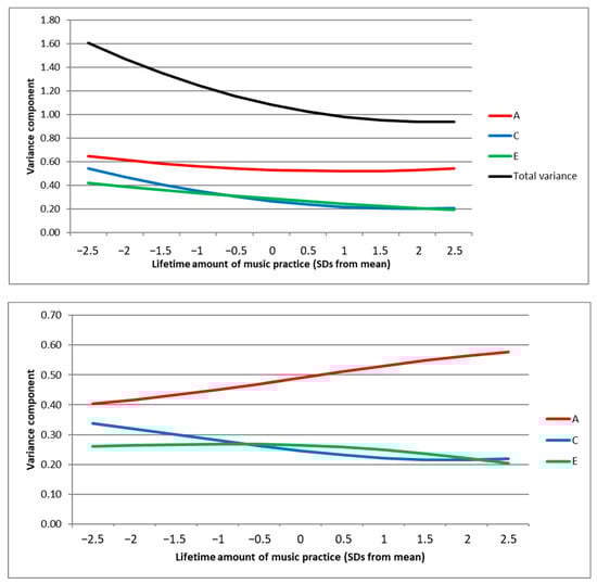 Figure 2 (top panel) illustrates that the overall variance in musical expertise diminishes with more practice hours, as do the C and E variance components (although the decrease is not significant for C). The A influences on musical expertise stay relatively stable in absolute terms, with decreasing genetic influences that are shared with lifetime music practice and increasing unique genetic influences with more practice hours (see