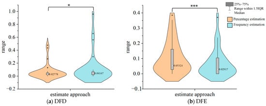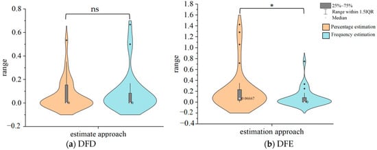 The results of the Wilcoxon signed ranks test revealed that for DFD, the estimation error of percentage estimation (Md = 0.03 (0.02~0.05)) was significantly lower than that using frequency estimation (Md = 0.04 (0.02~0.07)), Z = −2.45, p = 0.014. For DFE, the estimation error of percentage estimation (Md = 0.05 (0.03~0.17)) was significantly higher than that of frequency estimation (Md = 0.03 (0.00~0.10)), Z = −4.10, p < 0.001.