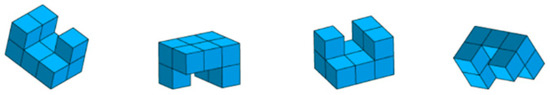 The first type of spatial task is called the mental rotation test, which is widely used for measuring spatial ability, especially for testing the capacity to mentally manipulate three-dimensional objects. Vandenberg and Kuse (1978) originally developed the MRT. In our research, each MR task presents four rotated alternatives, requiring examinees to identify the one figure that mismatches the other three after mental rotation (see Figure 2). The challenges may include mirrored versions, incorrect orientations, or cube placement. Performance on spatial reasoning tasks has been shown strongly associated with performance in fields such as engineering, architecture, and surgery, where professionals must mentally manipulate 3D objects (e.g., Shepard and Metzler 1971; Uttal et al. 2013).