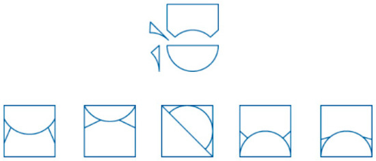 The second type of task is object assembly, also known as the Minnesota Paper Form Board Test (MPFBT) (Quasha and Likert 1937), which is a widely used assessment of visualization skills. This test requires examinees to mentally assemble given pieces to form a complete object, shown as Figure 3. The U.S. military commonly employs the OA test as a subtest of the ASVAB for enlistment and placement. OA tasks primarily measure two-dimensional rotation and visualization skills, classifying them as formboard tasks (Eliot and Smith 1983; Lohman 1979). Incorrect options may include misleading configurations such as misaligned curves, incorrect rotation, or geometrically incompatible combinations. OA tasks require the mental construction of complex wholes from parts, are relevant to mechanical reasoning and hands-on technical skills, especially for manufacturing, engineering, and even spatial problem solving in everyday tool use (e.g., Lohman 1996; Carroll 1993).