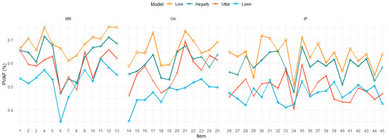 In CDM framework, Proportion of Variance Accounted For (PVAF) reflects the proportion of the total variability in the data that is explained by the model. Item-level PVAF can offer more details about how well the model accounts for the variance in responses to each specific item, supporting us make decisions on filtering items. In Figure 5, Linn’s model consistently outperforms others across all task types, standing around 0.7, indicating that it better captures the variance in the data. Hegarty’s model shows competitive performance, particularly in the MR item type. According to item-level PVAF, some items (e.g., 6, 14) show significantly lower PVAF (lower than 0.4) across all models, suggesting item misfit or modeling issues. The findings might indicate that these items are not well represented by the Q-matrix or are particularly challenging or ambiguous. Additionally, all models capture mental rotation tasks well, with the MR items exhibiting relatively high and stable PVAF. The OA and IP items show more fluctuation and variability, suggesting that item-specific dips need further investigation.