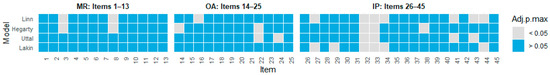 We applied Bonferroni correction approach for calculating the maximum adjusted correlation (Adj.p.max) between each item and all other items (Bonferroni 1936) to identify potential item redundancy or model misfit. In Figure 6, the heatmap shows the adjusted p-values for each item across four models, listed by rows (Linn, Hegarty, Uttal, and Lakin). Items with Adj.p.max less than 0.05 indicate significant correlation with other items, which is a signal of potential misfit (shown in light grey). Items with Adj.p.max greater than 0.05 suggest an acceptable fit (shown in blue).