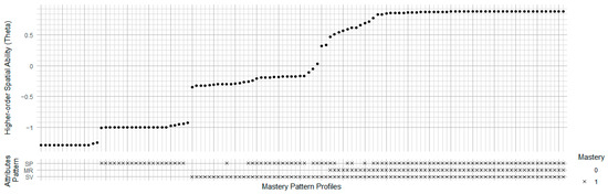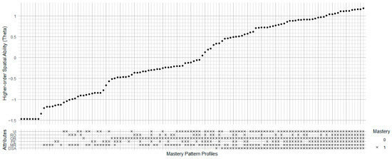 Higher-order LLM simultaneously estimates higher-order latent ability and attribute mastery probabilities. We created an Ability-Mastery Alignment Plot (AMAP) to visualize the relationship between higher-order latent ability (also known as theta, shown in top section) and mastery pattern profiles (shown in bottom section) derived from CDMs. For example, in Figure 4, the top section displays higher-order ability estimates, reflecting the general spatial ability level of each person, in which each dot represents an individual. The bottom section shows mastery pattern profiles across multiple attributes (e.g., spatial visualization (SV), mental rotation (MR), and spatial perception (SP), in which “×” markers indicate mastery (1) or blank markers for non-mastery (0) for each attribute. Combining the top and bottom sections, this plot indicates how individuals’ theta aligns with their mastery profile.