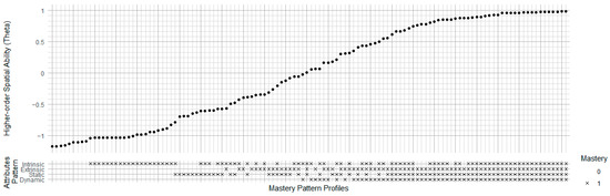 Figure 9 shows the relationship between higher-order spatial abilities and attribute mastery patterns in the Hegarty model. Like the Linn model, the rightmost points in the top plot also have the highest theta values (around 0.95) with full mastery across all four attributes (MT, SV, SO, and SWM) in the bottom plot. Theta decreases progressively with the absence of attributes, following the order of MT, SV, SO, and SWM. Notably, the absence of spatial working memory (SWM) (mastery pattern (1,1,1,0)) has only a slight impact on general ability (around 0.8), whereas the absence of mental transformation (MT) causes a substantial decrease in ability (around −0.2). This pattern indicates that while mastering mental transformation attributes is comparatively challenging for individuals, it is also the key element for achieving the highest general spatial ability.