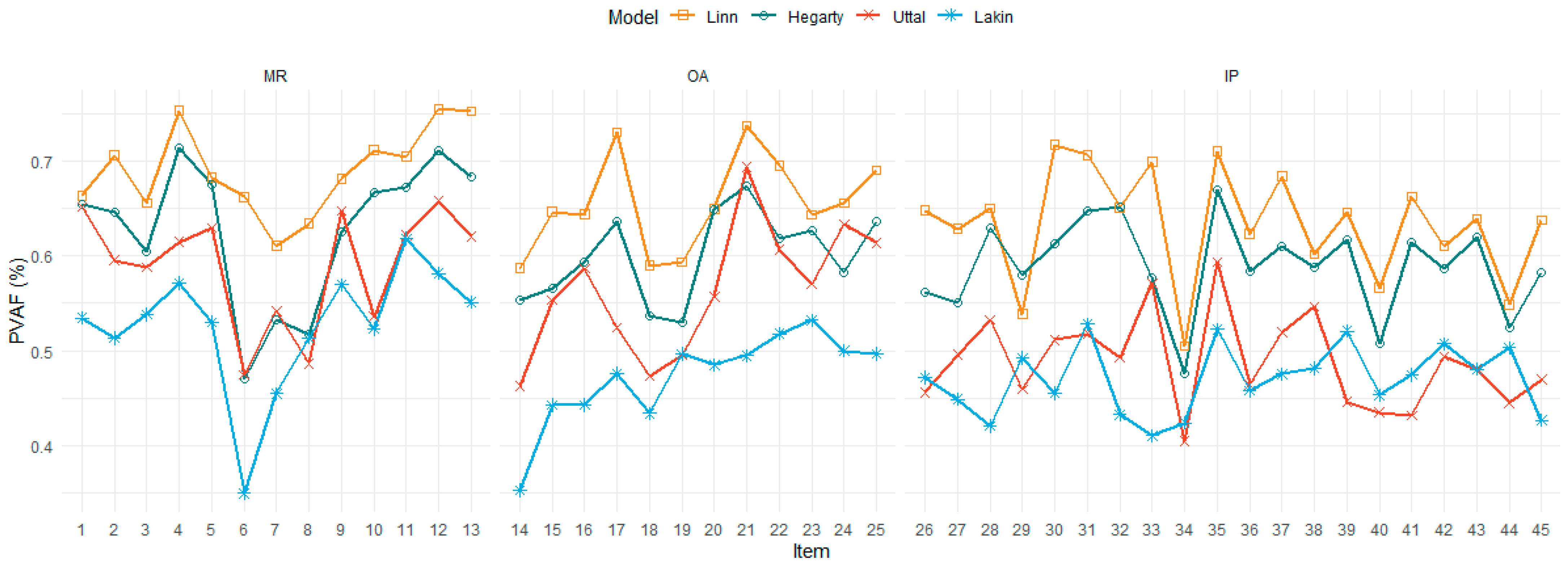 Figure 5, Linn’s model consistently outperforms others across all task types, standing around 0.7, indicating that it better captures the variance in the data. Hegarty’s model shows competitive performance, particularly in the MR item type. According to item-level PVAF, some items (e.g., 6, 14) show significantly lower PVAF (lower than 0.4) across all models, suggesting item misfit or modeling issues. The findings might indicate that these items are not well represented by the Q-matrix or are particularly challenging or ambiguous. Additionally, all models capture mental rotation tasks well, with the MR items exhibiting relatively high and stable PVAF. The OA and IP items show more fluctuation and variability, suggesting that item-specific dips need further investigation.