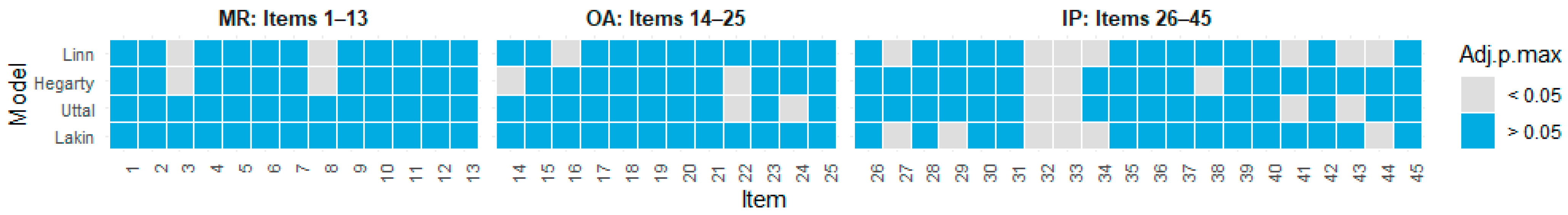 Across models, most items exhibit acceptable fit (blue), especially for the MR and OA tasks. However, there are notably problematic items concentrated in the IP tasks (Items 26–45). Specifically, items 32 and 33 consistently misfit across all models, which means that these items may be redundant or underrepresent this subset. Among four models, the Lakin model shows the best performance in MR and OA tasks, with fewer misfitting IP items. Overall, the heatmap of adjusted p-value identifies which items require further review and highlights the Lakin model relatively overperform other models in fitting diverse spatial item types.