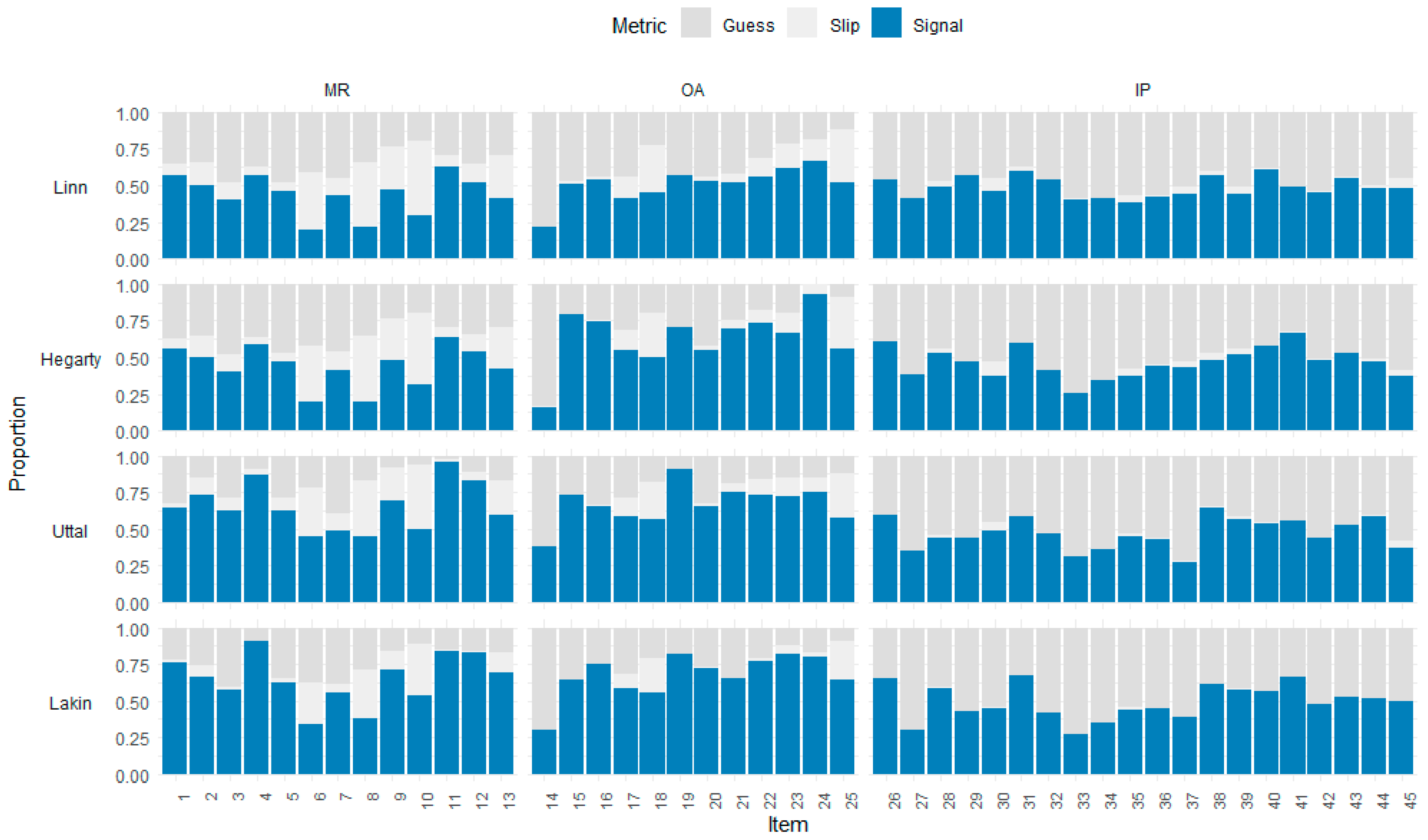 Regarding task type, the OA task showed the best performance with higher signal section (shown as blue) and smaller guessing and slipping parameters (gray and light grey, respectively), except item 14. Some items of MR task have higher guessing parameters, such as item 6, 8, and 19, indicating some participants with higher ability could answer incorrectly. The IP task type exhibits lower slipping parameters, but higher guessing parameters compared to the other two task types. This suggests that while children who understand the task tend to answer correctly without errors, others may guess, indicating that this type may be particularly challenging for younger examinees.