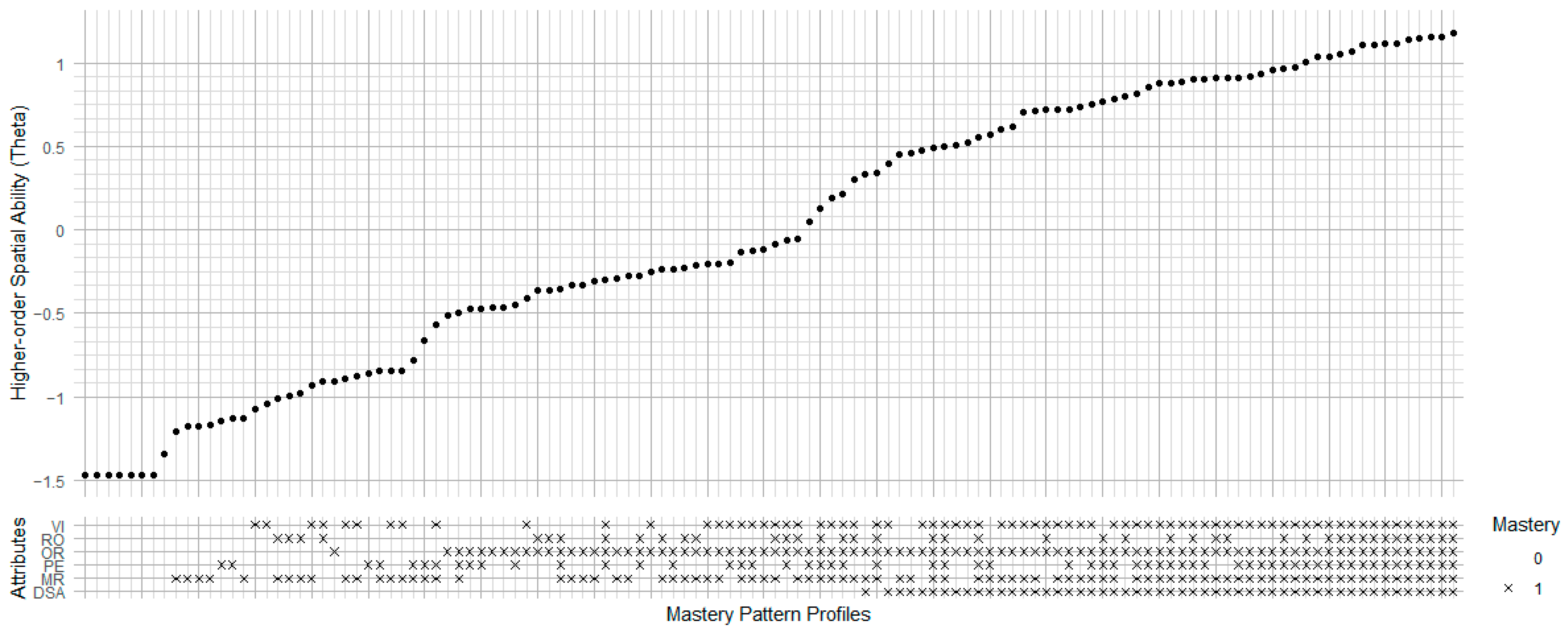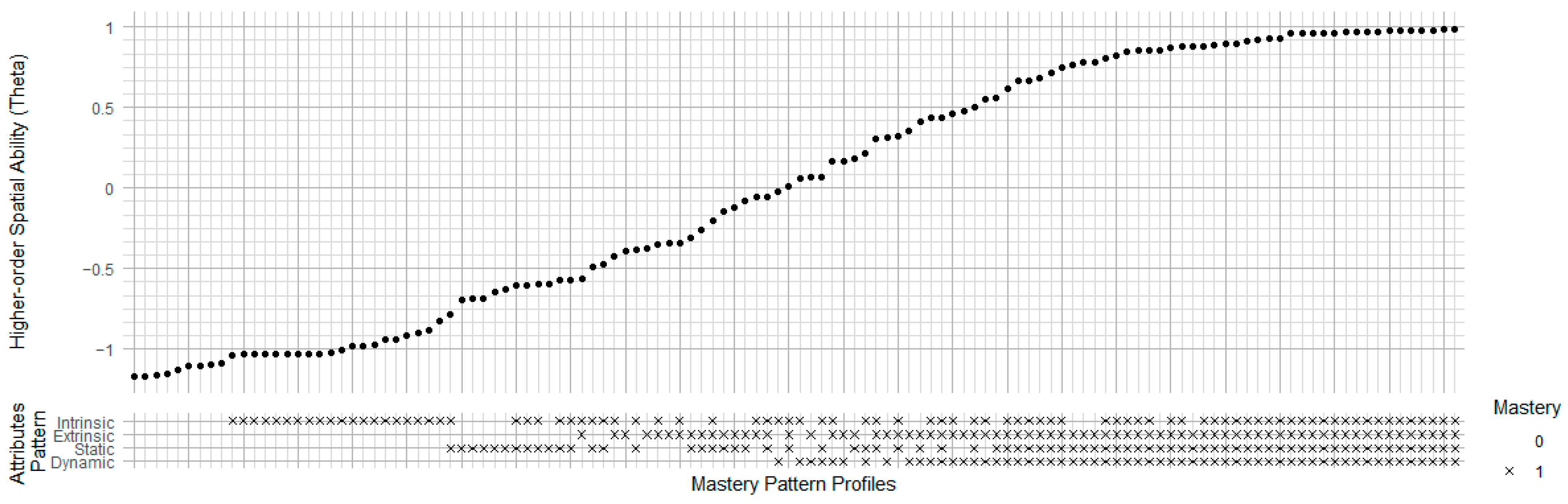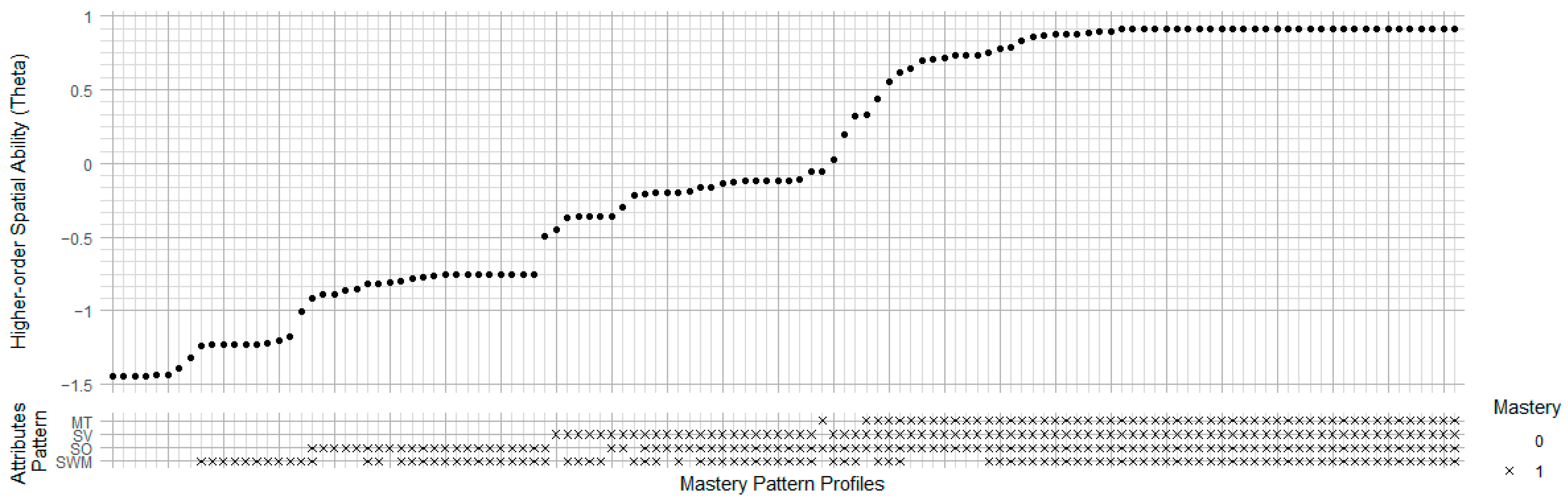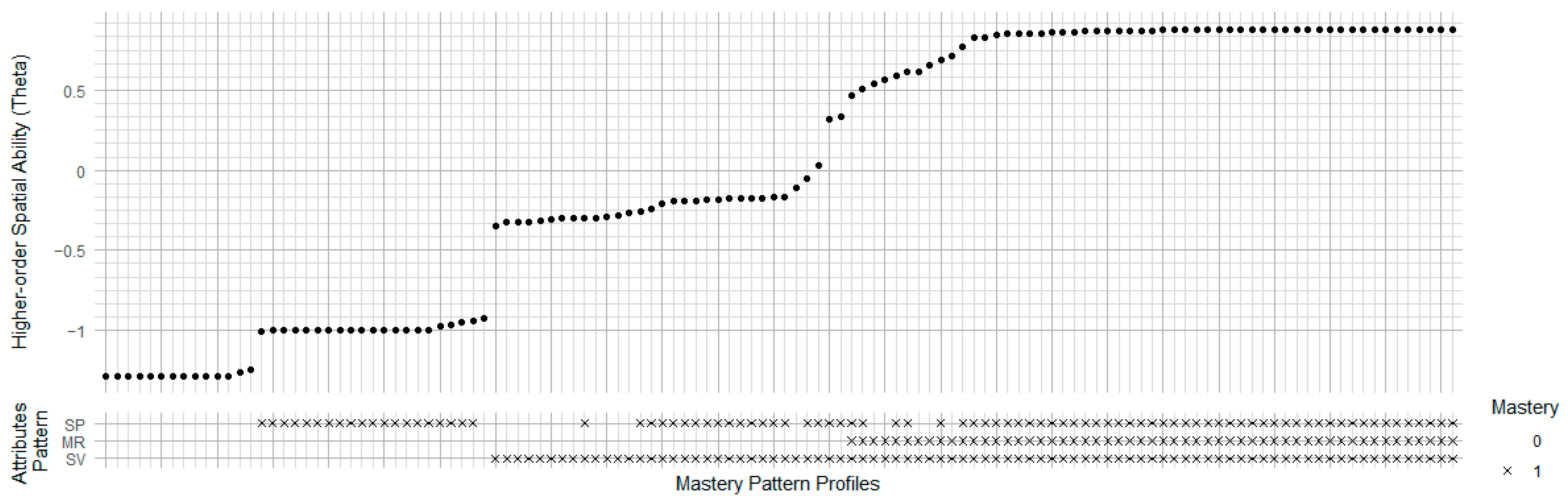 Figure 4, the top section displays higher-order ability estimates, reflecting the general spatial ability level of each person, in which each dot represents an individual. The bottom section shows mastery pattern profiles across multiple attributes (e.g., spatial visualization (SV), mental rotation (MR), and spatial perception (SP), in which “×” markers indicate mastery (1) or blank markers for non-mastery (0) for each attribute. Combining the top and bottom sections, this plot indicates how individuals’ theta aligns with their mastery profile.