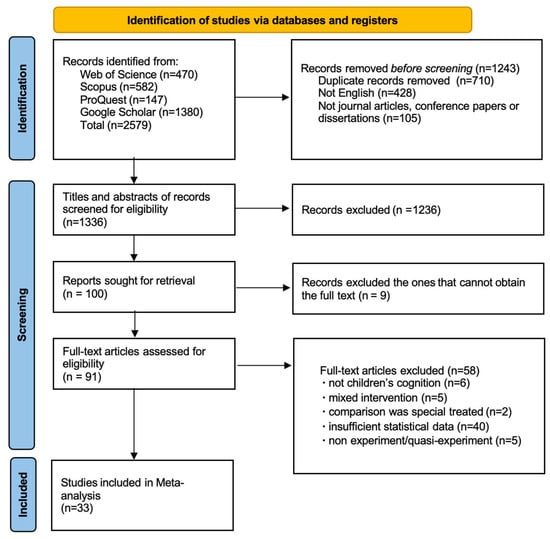 The PRISMA flowchart of the literature screening is shown in Figure 1. A total of 2579 articles were identified. After removing 710 duplicate records, 428 non-English publications, and 105 documents that were not journal articles, conference papers, or dissertations, 1336 records remained. Titles and abstracts screening excluded 1236 records; nine studies were removed due to unavailable full texts. After full-text review based on inclusion and exclusion criteria, 58 articles were further excluded. Ultimately, 33 studies were retained, providing 53 effect sizes from 4568 participants, spanning the period from 1979 to 2023.