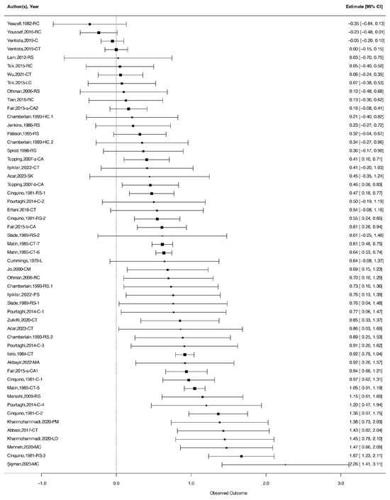 Outcome domains were classified according to the definitions provided by the original authors and the characteristics of the instruments employed. For example, reasoning skills were frequently assessed using the New Jersey Test of Reasoning Skills (NJTRS) (Lam 2012; Marashi 2008; Pálsson 1995); critical thinking was often measured with standardized instruments such as the Cornell Critical Thinking Test (CCTT) or the California Critical Thinking Skills Test (CCTST) (Erfani and Rezaei 2016; Acar and Arslan 2023); creativity was evaluated using the Torrance Test of Creativity, as well as the “What Could You Use It For?” and “What Could It Be?” tasks (Pourtaghi et al. 2014; Cinquino 1981). General cognitive abilities were assessed with the Cognitive Abilities Test (CAT) (Fair et al. 2015a, 2015b; Topping and Trickey 2007a, 2007b), while reading comprehension was measured using a variety of instruments, including the General English Proficiency Test (Tian and Liao 2016), the Test of Reading Comprehension (TORCH) (Youssef et al. 2016), TOEFL (Othman and Hashim 2006), the reading comprehension subtest of the Comprehensive Test of Basic Skills (CTBS) (Yeazell 1982), and researcher-designed Reading Comprehension Tests (Tok and Mazl 2015).