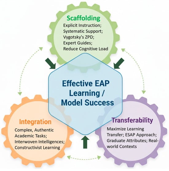 - Transferability: The curriculum is explicitly designed to maximize the transfer of learning from the EAP classroom to other academic, professional, and social contexts (Perkins and Salomon 1992). This is achieved through two primary mechanisms. First, by explicitly connecting EAP tasks to the demands of students’ specific disciplines (an English for Specific Academic Purposes, or ESAP, approach), ensuring immediate relevance. Second, by framing the skills learned within the broader context of institutional graduate attributes (e.g., “critical thinking,” “innovation,” “global citizenship”), making their value and applicability clear to students, faculty, and administrators (Barrie 2004; James 2014). This focus on transfer transforms EAP from a preliminary hurdle into a foundational component of a student’s entire educational trajectory. The interplay of these principles is visualized in Figure 2.