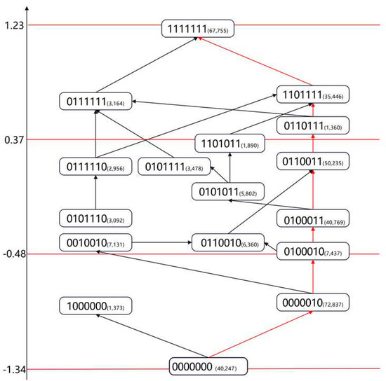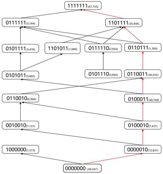 Generation of Pathway Sequences: Given the complexity of learning trajectories, this study focuses on first-order transitions—paths between adjacent levels that differ by the mastery of a single attribute. A path is established when one knowledge state is a subset of another. For instance, the state (0110011) is a subset of (0110111) if the latter includes all attributes of the former plus an additional one (e.g., the fifth attribute). This subset-based identification mirrors the modeling logic of attribute hierarchy models and reveals the likely order in which students acquire knowledge (Leighton and Gierl 2007b). For example, in the domain of English reading comprehension among high school students, a representative learning pathway identified in this study is: