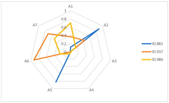 A key advantage of Cognitive Diagnostic Assessment lies in its ability to generate individualized knowledge profiles for each student. To demonstrate the granularity and diagnostic power of this method, we conducted an in-depth analysis of three representative students, identified as IDs 882, 937, and 986. Their radar charts (see Figure 3) vividly illustrate their distinct strengths and weaknesses across the seven cognitive attributes, offering clear guidance for personalized instruction.