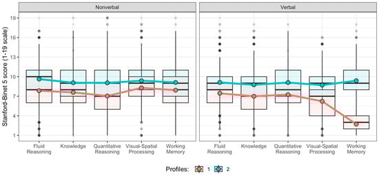 Figure 1 illustrates the two identified profiles. Table 3 presents the descriptive statistics for all SB5 domains by profile, along with t-test results and Cohen’s d effect sizes. Independent-samples t-tests with Welch’s correction revealed statistically significant differences across all 10 SB5 domains between the profiles (all p < .01).