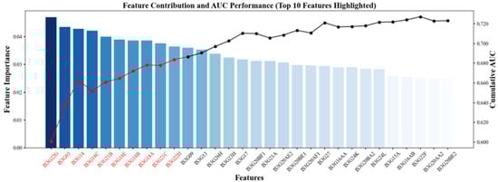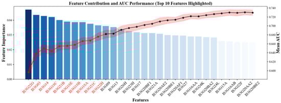 To assess the robustness of the feature subset, we conducted a 10-fold cross-validation analysis. As shown in Figure 4, the red dots represent the top 10 features that contributed most significantly to the AUC gains across the different folds. The consistent performance of these features across data splits demonstrates the predictive stability and generalizability of the selected variable set.