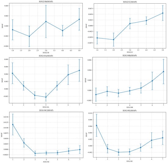 To further examine these nonlinear effects, SHAP dependence plots were generated for each of the 10 key features (Figure 6) to illustrate the relationships between the feature values and their SHAP contributions and to highlight potential thresholds and nonlinear trends.