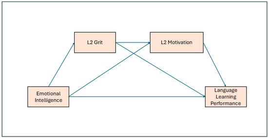 The Control–Value Theory (Pekrun 2006; Pekrun and Perry 2014) provides a theoretical rationale for this sequence, positing that emotions influence learners’ perceived control and value appraisals, which in turn sustain perseverance (grit) and fuel motivation. From this perspective, emotionally intelligent learners are better able to regulate negative emotions such as anxiety and to maintain long-term commitment, which subsequently reinforces motivational intensity and engagement (Teimouri et al. 2022; Gao 2025). The L2 Motivational Self System (Dörnyei 2009) similarly supports this temporal ordering, as the ability to persevere toward one’s ideal L2 self-fosters sustained motivation to achieve it. Therefore, in the present study, grit is conceptualized as a precursor of motivation, representing the self-regulatory stamina that enables learners to translate emotional resources into enduring motivational engagement over time. EI may not only exert direct effects on language performance but also indirectly influence achievement through the sequential pathway of grit and motivation.