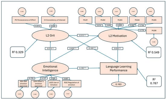 Structural equation model illustrating the relationships among emotional intelligence, L2 grit, L2 motivation, and language learning performance, with standardized path coefficients, loadings, residuals and R2 values. *** p < 0.001.
