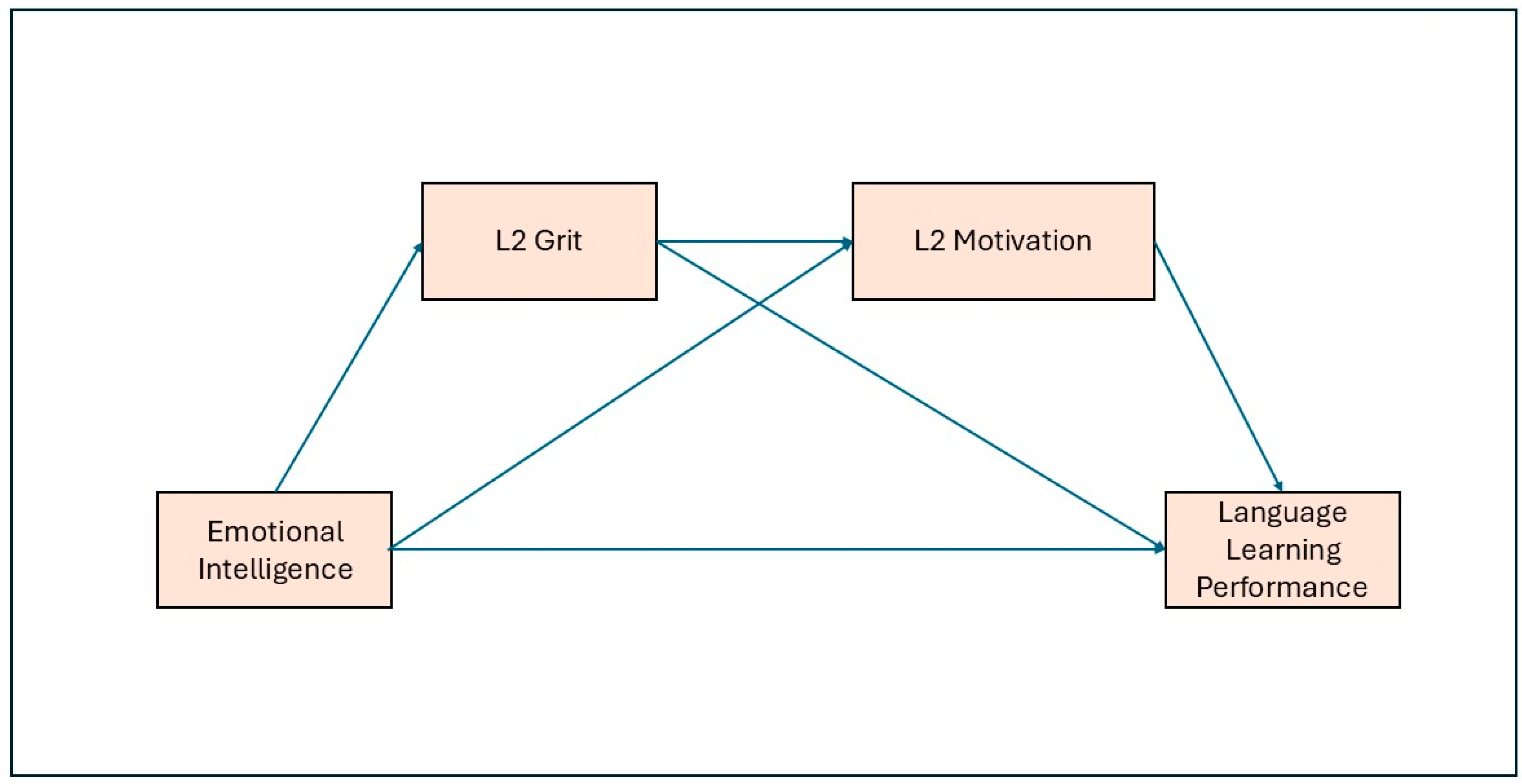 Peng and Li 2025). To address this gap, the present study investigates how Chinese ESL learners’ emotional intelligence (EI) relates to their language learning performance through the sequential mediation of L2 grit and L2 motivation. By integrating these three constructs into a chain mediation framework, the study aims to clarify the emotional–motivational mechanisms that underlie language achievement. Specifically, this research makes three verifiable contributions. Firstly, at the theoretical level, it extends the application of the Control–Value Theory (