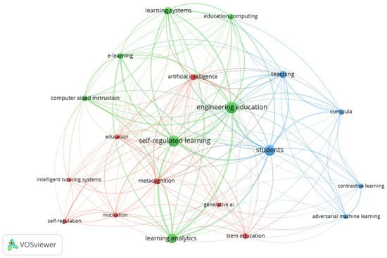 A keyword co-occurrence analysis was conducted to identify the most prominent AI-related concepts and tools within the literature on metacognition in STEM education. As shown in Table 2 (ranked by frequency) and visualised in Figure 3, the most frequently occurring AI-related term was learning analytics (n = 43), underscoring its centrality in supporting and monitoring self-regulated learning processes. Other high-ranking terms include learning systems (n = 25), artificial intelligence (n = 20), and e-learning (n = 17), suggesting widespread integration of digital and intelligent technologies in STEM education. Notably, emerging approaches such as adversarial machine learning and contrastive learning (each n = 11), along with generative AI (n = 10), reflect increasing interest in advanced AI models. Traditional applications, such as intelligent tutoring systems (n = 10), also remain relevant, particularly in fostering the use of metacognitive strategies. These findings illustrate a shift from established AI tools toward more sophisticated, data-driven educational technologies.