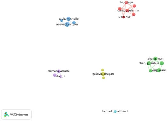 A co-authorship and productivity analysis revealed leading contributors to the literature on AI and metacognition in STEM education. As shown in Table 4 and visualised in Figure 4, Roger Azevedo leads with eight publications and 399 citations, reflecting strong and sustained engagement. Dragan Gašević follows with six publications and the highest citation count (720), highlighting his significant influence in the field. Other frequently publishing authors include Guanhua Chen, Charles Xie, Wanli Xing, Juan Zheng, and Michelle Taub, each with six publications. The VOSviewer map in Figure 4 displays author co-authorship networks, where the largest connected cluster comprises six items, indicating limited but growing collaboration among core researchers. These findings suggest a concentrated yet expanding scholarly community contributing to AI-driven metacognitive research in STEM education.