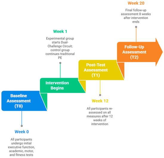 The intervention was delivered throughout twelve consecutive weeks, with three sessions per week, each lasting approximately sixty minutes including warm-up and cool-down activities (Figure 1). Classes were randomly assigned either to experimental conditions, which involved participation in the Dual-Challenge Circuit based on complex motor schemes, or to the active control condition, consisting of traditional physical education activities matched for total duration and overall intensity but without explicit cognitive demands such as rule switching, dual-tasking, or reactive decision making.