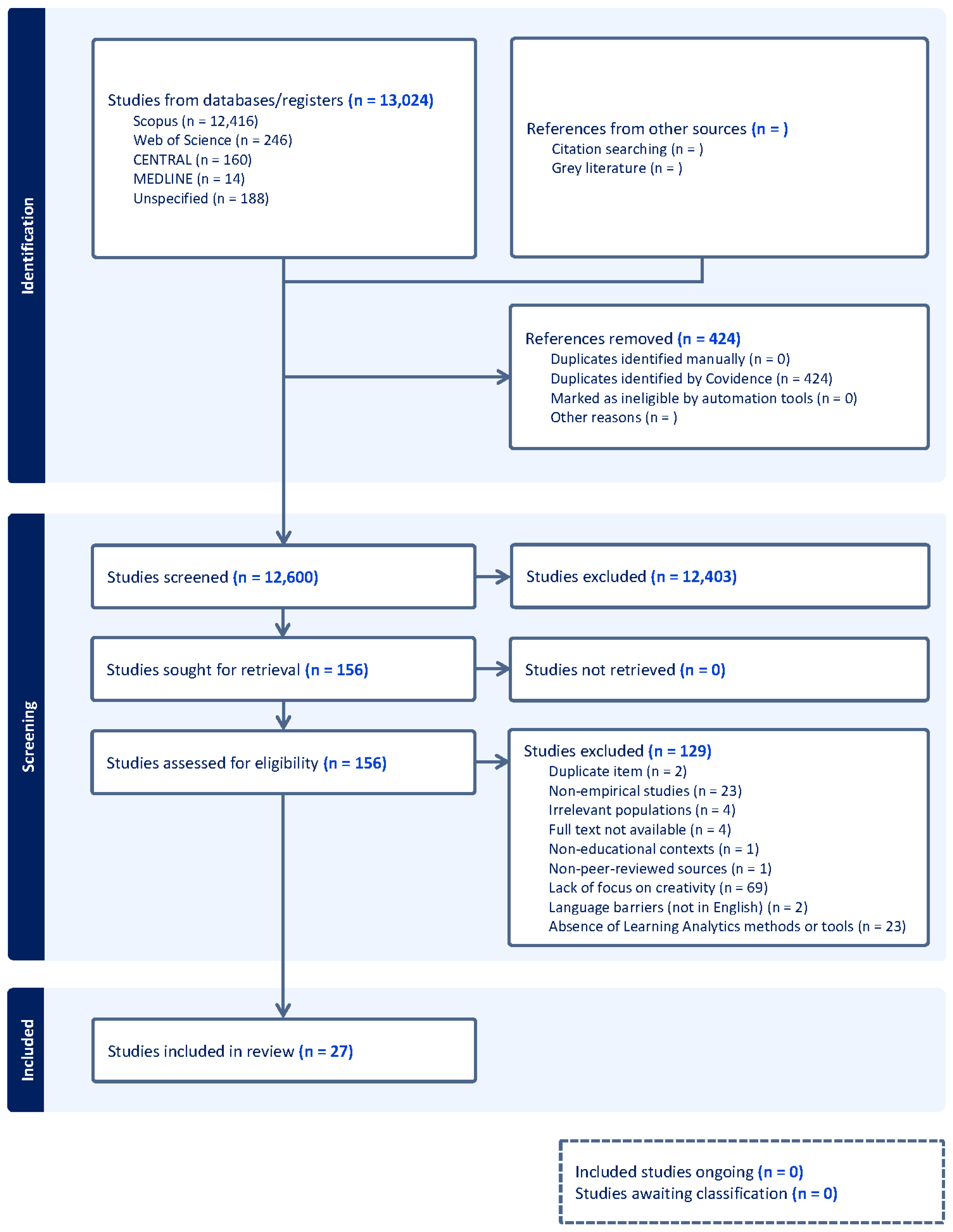 Chicago/Turabian StyleMirzaei, Siamak, Hooman Nikmehr, Sisi Liu, and Fernando Marmolejo-Ramos. 2025. "Creativity in Learning Analytics: A Systematic Literature Review" Journal of Intelligence 13, no. 12: 153. https://doi.org/10.3390/jintelligence13120153