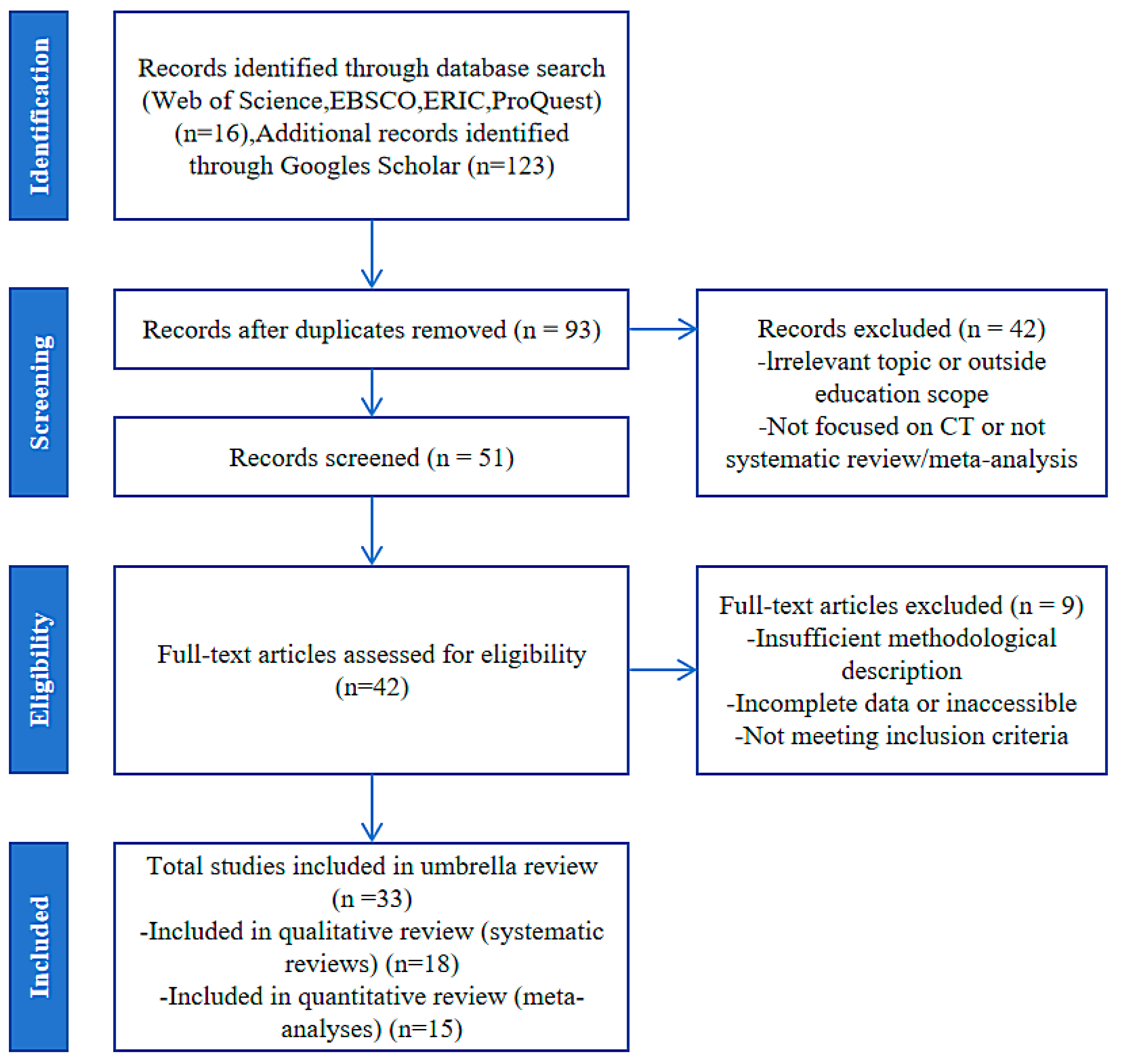 Zhang, J.; Wu, Y.; Ning, Y.; Shi, Y. From Evidence to Insight: An Umbrella Review of Computational Thinking Research Syntheses. J. Intell. 2025, 13, 157. https://doi.org/10.3390/jintelligence13120157