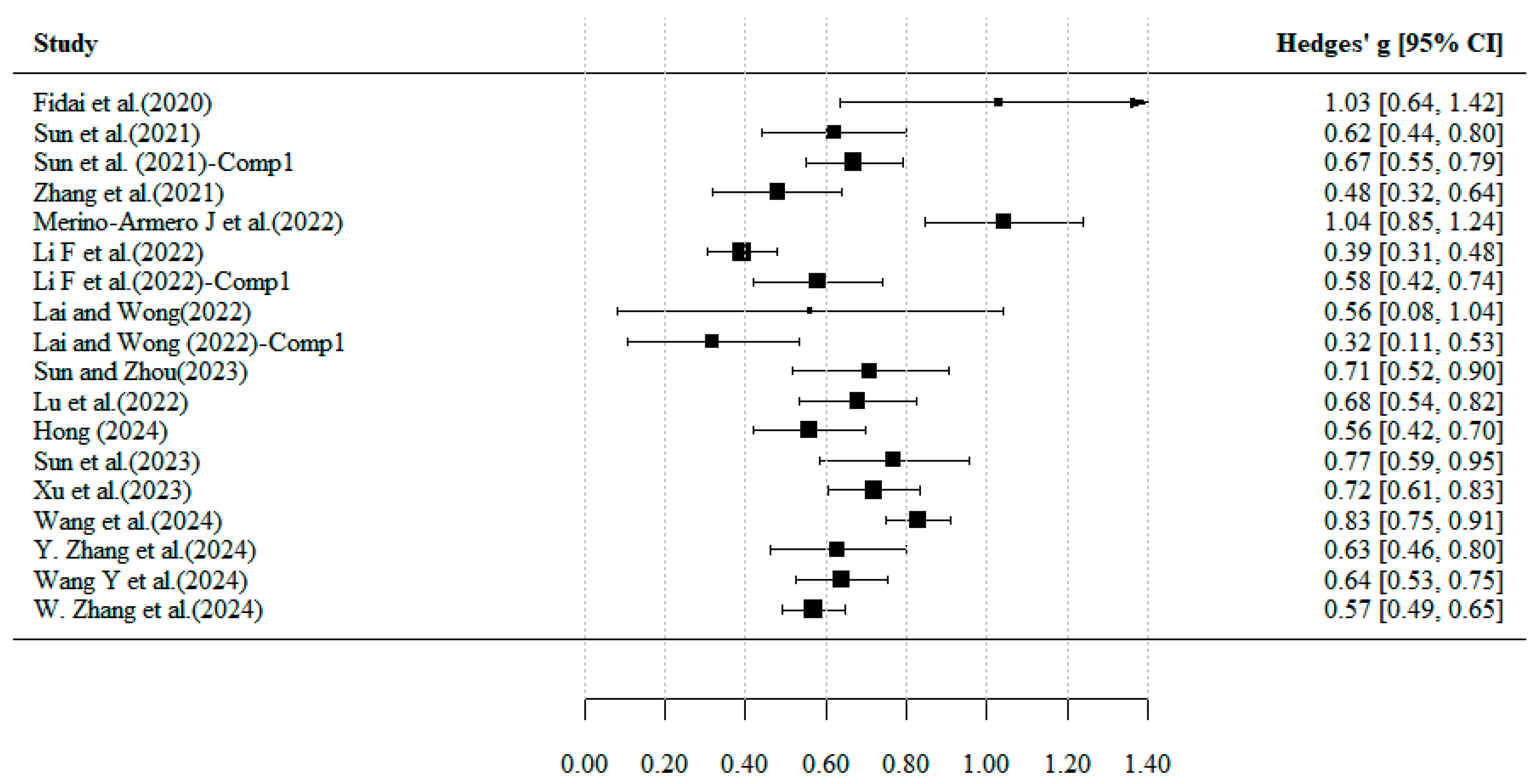 | 14 | Wang and Xie (2024) | Web of Science, Google Scholar, Science Direct | 2012–2022 | 26 | 33 | 3381 | Grade Level, Study duration, Culture, Learning strategy, Assessment tools | robot-supported learning | CT skills | Hedges’ g | 0.643 | [0.528, 0.757] | <0.001 | 105.082 (0.000) | 69.45% | Y |