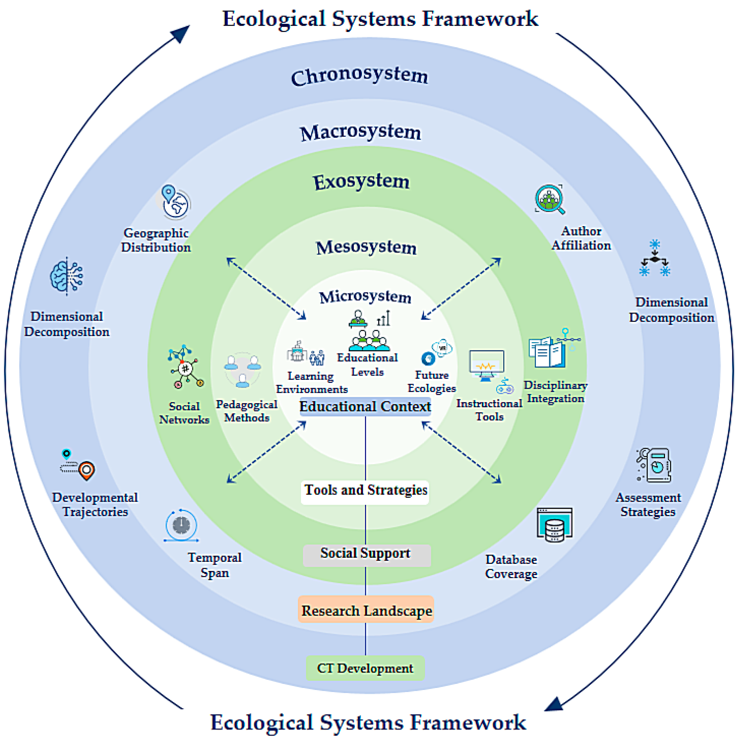 4.3. How Are Factors Influencing CT Development Distributed Across System Ecological Levels (Individual, Micro, Meso, Exo, Macro)?