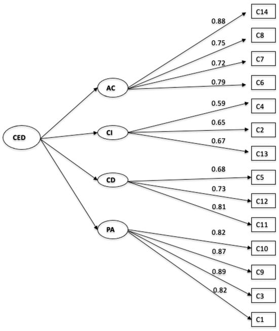 After eliminating three items via IRT and two items due to the absence of responses in the lowest response category, an EFA was conducted again to confirm the four-factor structure of CED with a 14-item scale. Results of the Kaiser–Meyer–Olkin measure of sampling adequacy (0.90) and Bartlett’s test of sphericity (χ2 = 3045.222; p < .001) confirmed the suitability of the data for factor analysis (see Table 5). A varimax rotation was applied with four fixed factors to extract. To facilitate interpretation of the components, the same criteria adopted in the previous EFA were maintained.