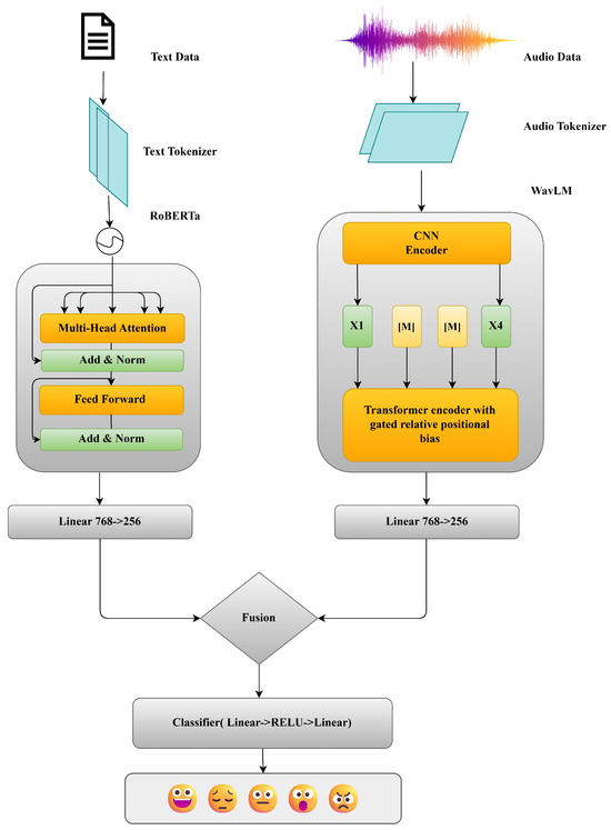To reconcile the heterogeneous representations produced by the audio and text encoders, each 768-dimensional embedding is linearly projected into a common 256-dimensional subspace. Formally, let denote the audio embedding derived from WavLM, and the text embedding derived from RoBERTa. The projections are defined as: