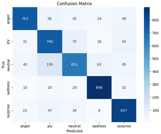Figure 3 presents the confusion matrix for the proposed multimodal affective state recognition model, integrating RoBERTa for textual encoding and WavLM for acoustic representation. The matrix provides insight into per-class behavior and recurring patterns of agreement and confusion between affective states.