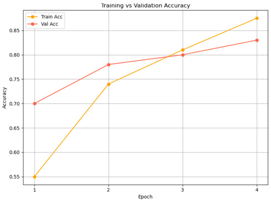 Figure 4 presents the training and validation accuracy progression of the proposed multimodal model—leveraging RoBERTa for textual encoding and WavLM for acoustic representation—over four epochs. The model demonstrates consistent improvement in performance, with training accuracy rising from 55% to 87% and validation accuracy increasing from 70% to 83%. Notably, the validation accuracy initially exceeds the training accuracy, likely due to the benefits of pretrained features enabling early generalization. As training advances, the gap between the two narrows, with both metrics converging at high accuracy levels by the final epoch. The relatively small divergence between training and validation curves indicates that the model is learning meaningful patterns without overfitting, affirming the effectiveness of the RoBERTa-WavLM architecture in capturing and generalizing affective cues across modalities. The training process employed early stopping, which halted optimization at epoch 4 when no further improvement in validation performance was observed. Consequently, Figure 4 presents results up to epoch 4, representing the complete effective training phase.