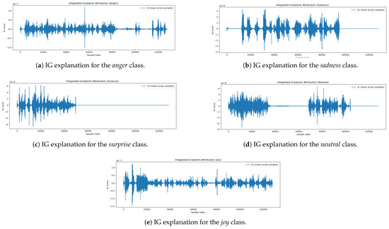 Below, we present and analyze the IG attribution plots for five affective state classes: Joy, Neutral, Surprise, Sadness, and Anger. The IG attribution plot for the Joy Figure 5e class exhibits multiple regions of positive and negative contribution dispersed across the waveform. Prominent peaks appear both early (0–20,000 samples) and later (80,000–120,000 samples), indicating that the expression of joy is temporally distributed across the utterance. These regions likely reflect prosodic features such as pitch variation, vocal energy, and rhythmic intonation—hallmarks of joyful expression. The model’s attribution behavior suggests that it aggregates evidence from various segments of the input rather than relying on isolated features. The Neutral Figure 5d class attribution pattern is marked by two primary zones of IG activity—approximately from 0–30,000 samples and again from 65,000–100,000 samples—separated by a long segment of near-zero attribution. This suggests the model identifies neutrality based on the relative absence of emotional cues, such as flat prosody or steady pitch. The inactive region may correspond to pauses or emotionally ambiguous content. Overall, the attribution behavior aligns with human perception, wherein neutral speech is characterized by consistent, emotion-free delivery. For the Surprise Figure 5c class, the attribution plot shows that most relevant information is located at the beginning of the waveform (0–50,000 samples), with attribution scores dropping to near zero afterward. This pattern implies that cues related to surprise—such as abrupt changes in pitch or vocal intensity—are detected early in the utterance. The model appears to rely on these strong early signals for prediction, while later portions of the audio contribute little additional information. The IG scores for Sadness Figure 5b display a rhythmic, oscillatory pattern with alternating peaks and troughs throughout the waveform. These patterns suggest the presence of sustained prosodic features such as slow tempo, low pitch, and extended vowel durations. Unlike Surprise, which is detected through brief and sharp cues, sadness is expressed gradually, requiring the model to extract information across the entire utterance. This behavior is consistent with affective science literature on the vocal expression of sadness. The attribution plot for Anger Figure 5a reveals high-density IG activity in both the early and late portions of the signal. The early peaks (0–30,000 samples) likely correspond to abrupt vocal onsets or tense articulation, while a secondary cluster of IG scores around 110,000–125,000 samples suggests sustained or recurring emotional intensity. These patterns indicate that anger is conveyed through repeated vocal emphasis and high-intensity speech characteristics that the model learns to recognize across time. The IG-based attribution analysis confirms that the model attends to class-specific and semantically meaningful regions of the speech signal. While emotions such as Surprise are captured through early, discrete cues, others like Sadness and Joy require extended temporal context. These findings indicate that the model leverages meaningful multimodal patterns rather than relying on random feature associations, supporting the plausibility and interpretability of its affective predictions.