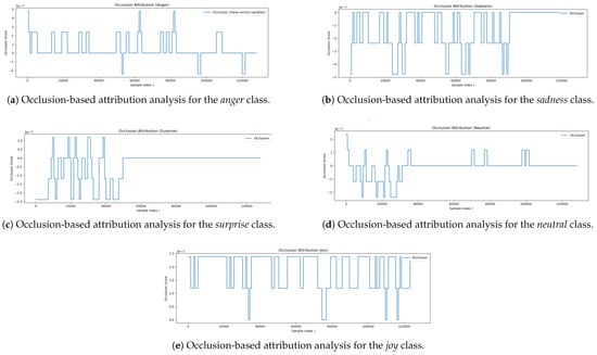 The occlusion attribution results for five affective state classes—Joy, Neutral, Surprise, Sadness, and Anger are presented and interpreted below. The occlusion plot for Joy Figure 6e reveals a consistent sequence of positive attribution values throughout the waveform. Distinct peaks appear at regular intervals, suggesting that the model draws on a wide distribution of prosodic features across time to identify joyful expressions. The absence of large negative scores or flat regions indicates that joy is not localized to a specific moment, but rather is conveyed through sustained acoustic patterns such as expressive intonation, rhythmic pacing, and vocal energy. These observations align well with established linguistic markers of joy. In the Neutral Figure 6d case, the occlusion pattern shows alternating positive and negative scores primarily in the early part of the waveform, with minimal attribution later on. This suggests that the model recognizes neutrality based on the absence of strong emotional cues, focusing on flatter prosodic features and more stable vocal delivery. Negative occlusion scores may indicate segments that introduce ambiguity or faint emotion, which, when occluded, increase the model’s confidence in neutrality. The sparse attribution is consistent with the idea that neutral speech lacks prominent emotional markers. The attribution plot for Surprise Figure 6c shows concentrated activity in the initial portion of the signal (up to 50,000 samples), beyond which attribution scores drop to zero. This implies that the model primarily identifies surprise through early acoustic events—such as sharp pitch changes, vocal bursts, or high speech energy—which are typical indicators of sudden emotional expression. Once these features are detected, subsequent segments appear to contribute minimally to the model’s decision. This front-loaded pattern is consistent with the temporal nature of surprise in spoken language. The occlusion attribution for Sadness Figure 6b is more diffuse and exhibits mostly negative scores spread across the waveform. These indicate that masking certain segments actually improves the model’s confidence, suggesting those parts may introduce confusion or interfere with the detection of sadness. This behavior suggests that sadness is encoded through more subtle and temporally sustained features—such as slow articulation, soft vocal quality, and elongated phonemes. The model’s ability to suppress irrelevant or contradictory segments highlights its capacity to isolate emotional consistency within longer utterances. The occlusion attribution plot for Anger Figure 6a exhibits a structured pattern with distinct positive spikes, particularly in the early segment (0–10,000 samples) and around 60,000 and 80,000 samples. These peaks likely correspond to salient acoustic features of anger, such as elevated vocal intensity, abrupt onsets, and harsh articulation. Notably, several regions—including those near 55,000, 95,000, and 120,000 samples—yield negative attribution scores, suggesting that their removal enhances the model’s confidence. These segments may contain ambiguous or conflicting emotional cues. Overall, the alternating pattern of positive and negative scores indicates that the model does not rely solely on isolated expressions of anger, but instead integrates and filters contextual information over time. This reflects a nuanced understanding of the temporal dynamics underlying emotional speech. The occlusion-based analysis provides valuable insight into how the model differentiates between emotional categories. Emotions such as Surprise are detected through brief, high-salience events occurring early in the signal, while others such as Joy and Sadness are more diffuse, requiring temporal integration over the full utterance. The diversity in occlusion patterns across classes confirms that the model has captured a relationship with specific acoustic cues with distinct emotional meanings, reinforcing its interpretability and alignment with human-like reasoning.
