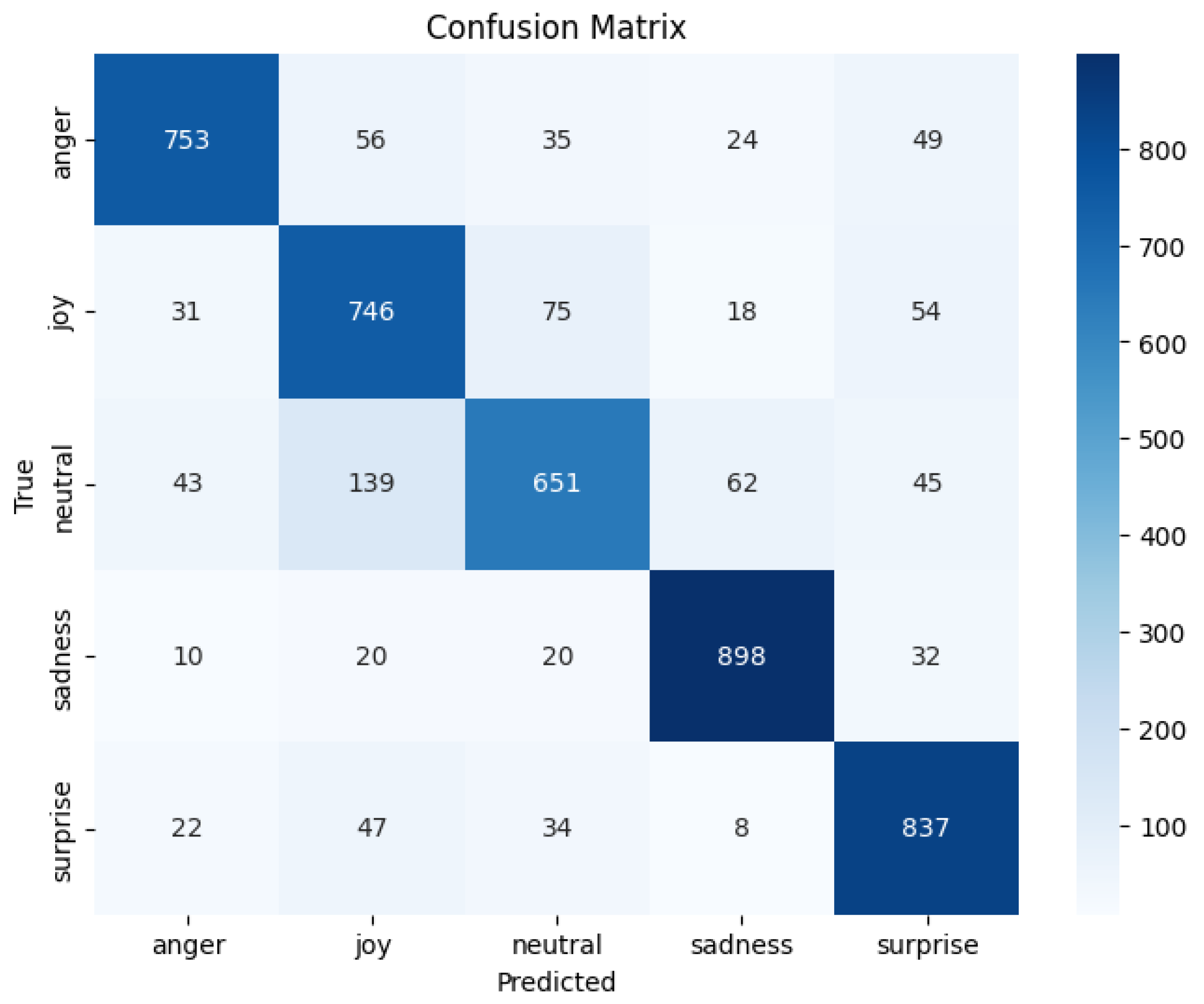 The model obtain total accuracy of 83%, indicating its ability to effectively integrate linguistic and acoustic cues for affective state recognition. Among all classes, the best performance is observed on Sadness (F1-score: 0.90), followed by Anger and Surprise (both with F1-scores of 0.85). These results suggest that affective states with strong lexical or prosodic markers are more easily captured by the model.