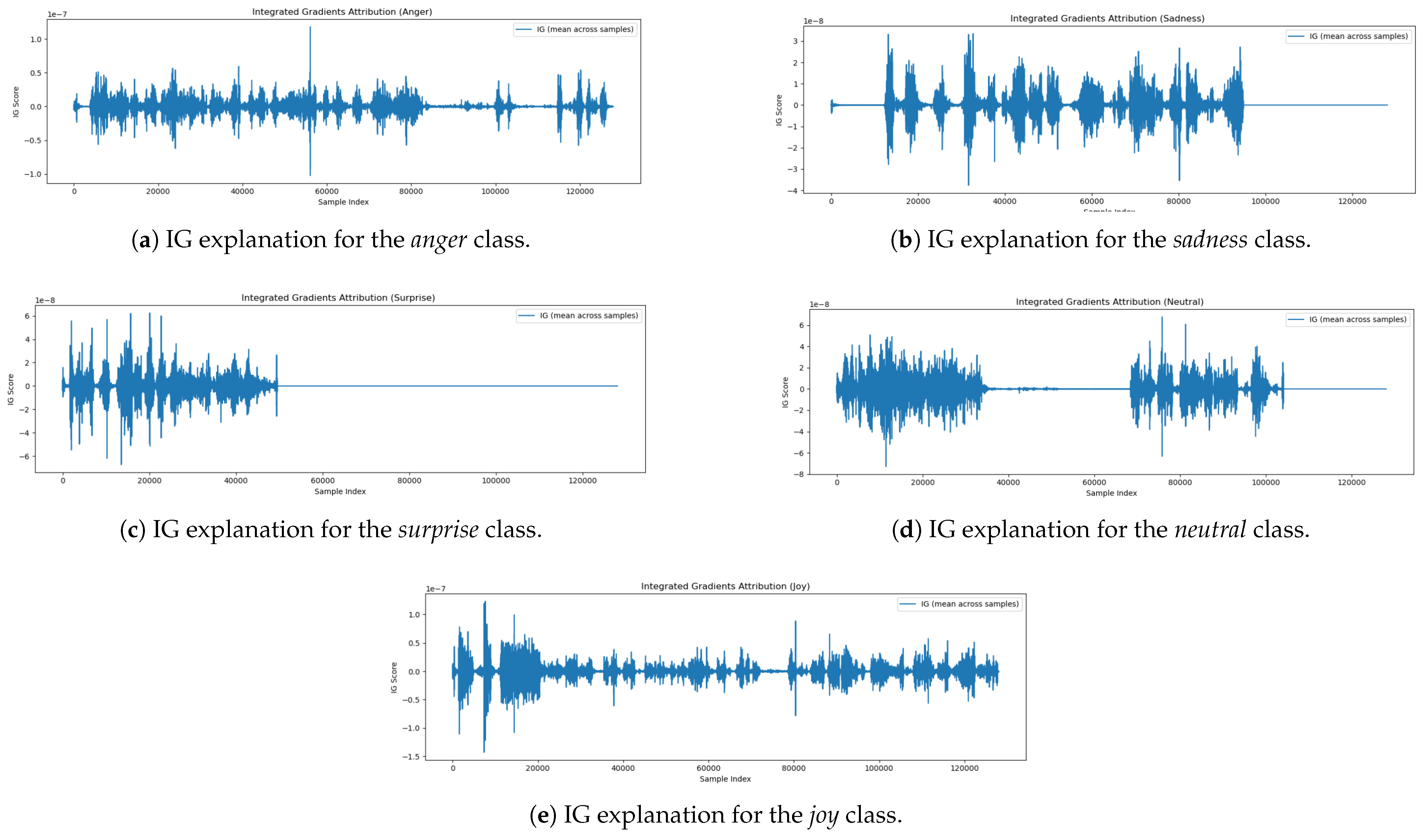 To understand how the model identifies emotional cues within speech, we employed the Integrated Gradients (IGs) method to visualize input feature attributions for different affective state classes. IG estimate the influence of each input feature by accumulating the gradients of the model’s prediction with respect to the input, traced along a linear trajectory from a baseline (commonly zero) to the actual input. This technique provides fine-grained insights into which parts of the audio waveform contribute most significantly to the model’s predictions.