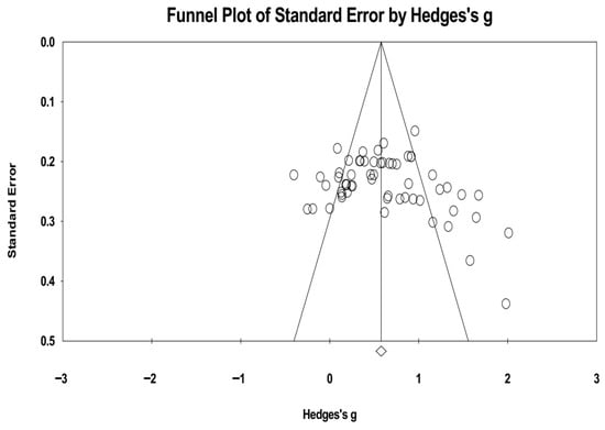 The assessment of publication bias revealed no strong evidence of severe distortion in the current meta-analysis. The funnel plot constructed from the 29 included studies showed that a total of 8 individual data points fell outside the slope lines, but a generally symmetrical distribution of data points around the mean effect size was observed (see Figure 2). However, visual inspection suggested a possible slight skew to the right, which corresponds with the findings of Egger’s test.