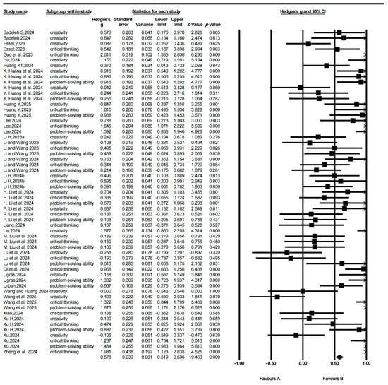 Based on established methodological practices, a random-effects model was employed in this study to account for heterogeneity among the included studies. Hedges’s g was selected as the measure of effect size to assess the impact of Gen-AI on students’ HOT. As presented in Table 3, the analysis yielded an overall effect size of 0.609, indicating that Gen-AI has a moderately significant and statistically meaningful impact on students’ HOT abilities. In other words, the findings support the conclusion that Gen-AI is effective in enhancing students’ HOT skills. The effect forest plot is shown in Figure 3.