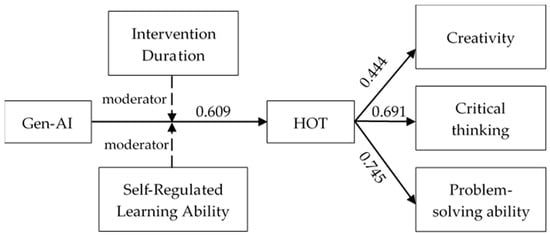 This study further examined the effects of Gen-AI on the three core dimensions of students’ HOT: creativity, critical thinking, and problem-solving, as presented in Table 4. The findings indicate that Gen-AI had the most pronounced impact on students’ problem-solving ability, with an effect size (ES) of 0.745, which falls within the moderately significant range (0.5 ≤ ES < 0.8) and is statistically significant (p < 0.001). This suggests that Gen-AI exerts a substantial positive influence on enhancing students’ problem-solving skills.