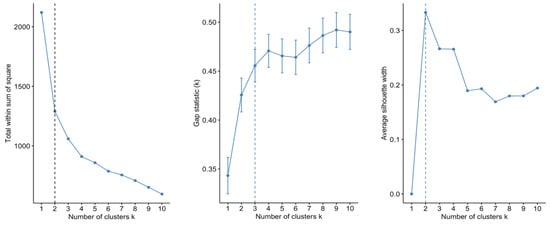 Both the elbow and silhouette methods indicated a two-cluster solution, whereas gap statistics suggested a three-cluster structure (Figure 1).