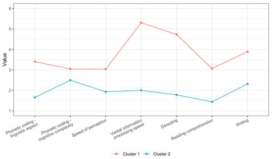 Cluster centroids for the 2-cluster fuzzy C-means solution across seven cognitive–linguistic processing skills.