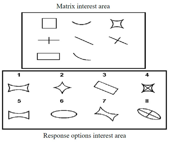 Example of an item in Raven’s advanced progressive matrices. This item involves a three-by-three matrix, with graphical elements in the matrix interest area and eight options in the response options area. One cell in the matrix is missing, and it needs to be selected from the response options area using analogy and inductive reasoning.