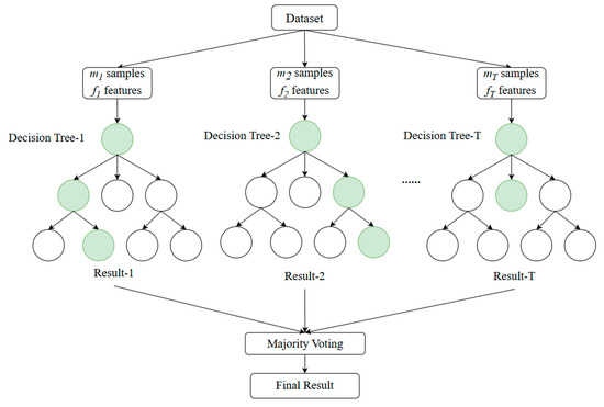 Random forest is an ensemble learning algorithm developed based on decision trees, meaning a random forest consists of multiple decision trees (Breiman 2001). By combining the predictions of multiple decision trees, the random forest algorithm can significantly improve the model’s accuracy and robustness (Biau and Scornet 2016). Each tree is independently generated during training. For trees t (t = 1, 2, …, T), random samples with replacement (m samples) and random subsets of features (f features) are drawn from the training set to construct each tree (Figure 2). This introduces diversity in the decision-making process of each tree.