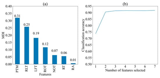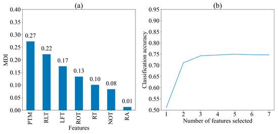 Importance of seven features for two cognitive strategies. (a) Mean decrease in impurity (MDI) of seven feature; (b) Classification Accuracy with Different Number of Features. PTM: proportional time on matrix; RLT: rate of latency to first toggle; LFT: latency to first toggle; ROT: rate of toggling; NOT: number of Toggles; RA: response accuracy; RT: response time.