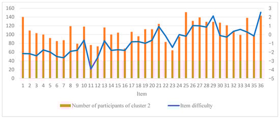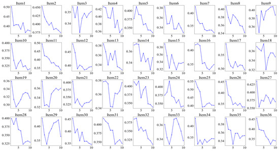 Additionally, as illustrated in Figure 6, it appears that participants increasingly adopt the strategy associated with Cluster 2 (i.e., the response elimination strategy) as the test progresses. Figure 9 further displays the item difficulty and the number of participants employing the response elimination strategy for each item. The results suggest a rising trend in item difficulty as item numbers increase, indicating that later items tend to be more challenging. Concurrently, the number of participants using the response elimination strategy also shows an upward trend. The Spearman rank correlation between item difficulty and the number of participants of response elimination strategy usage is 0.58 (p < 0.01), suggesting that as item difficulty increases, participants are more likely to employ the response elimination strategy. At the individual level, we further analyzed the relationship between participants’ performance and the frequency of using the constructive matching strategy. The results revealed a significant positive Pearson correlation (r = 0.33, p < 0.01) between participants’ scores on the 36 items and the number of times they employed the constructive matching strategy. Specifically, participants who used the constructive matching strategy more frequently tended to achieve higher scores. This finding indicates that the more often an individual uses the constructive matching strategy, the better they perform in the APM. Figure 10 presents the strategy identification results for each participant on every item. This detailed data allows for a meticulous examination of whether participants maintain a consistent cognitive strategy across various items or exhibit variations in their approaches. The results reveal that participants typically employ different strategies for different items, and this is associated with both the item difficulty and their intelligence levels (Liu et al. 2023).