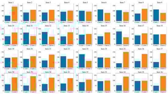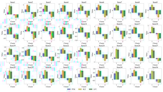 Furthermore, we conducted a K-means cluster analysis of the three eye-tracking metrics, PTM, RLT, and LFT, in order to explore whether it is possible to categorize the data into two or three classes. Figure 5 displays the average silhouette coefficients for each item when clustered into clusters 2~10. The results showed that, for the majority of the items (27 items), the dataset was optimally categorized into two clusters, followed by four clusters (5 items), which means participants were optimally categorized into two clusters based on these three eye-tracking metrics. Figure 6 and Figure 7 display the number of participants in two clusters and three eye-tracking metrics on each item, respectively. The number of participants categorized as Cluster 1 was lower than that in Cluster 2 across the majority of items. And for each of the three eye-tracking metrics, the participants in Cluster 1 exhibited significantly higher values than those in Cluster 2. This suggests that participants in Cluster 1 spend more time in the matrix area before looking at the options area for the first time and also focus more attention on the matrix area overall than those in Cluster 2. This indicates that they tend to extract more information from the matrix. Meanwhile, the paired-samples t-test results, as illustrated in Figure 8, revealed that participants in Cluster 1 demonstrated significantly higher values on PTM (t = 19.45, p < 0.01, Cohen’s d = 5.41), RLT (t = 70.78, p < 0.01, Cohen’s d = 7.56), and LFT (t = 47.36, p < 0.01, Cohen’s d = 6.91) across the 36 items compared to participants in Cluster 2. Additionally, participants in Cluster 1 exhibited significantly greater response accuracy (t = 5.35, p < 0.01, Cohen’s d = 0.38) and shorter response times (t = 5.14, p < 0.01, Cohen’s d = 0.21) on these items relative to Cluster 2.